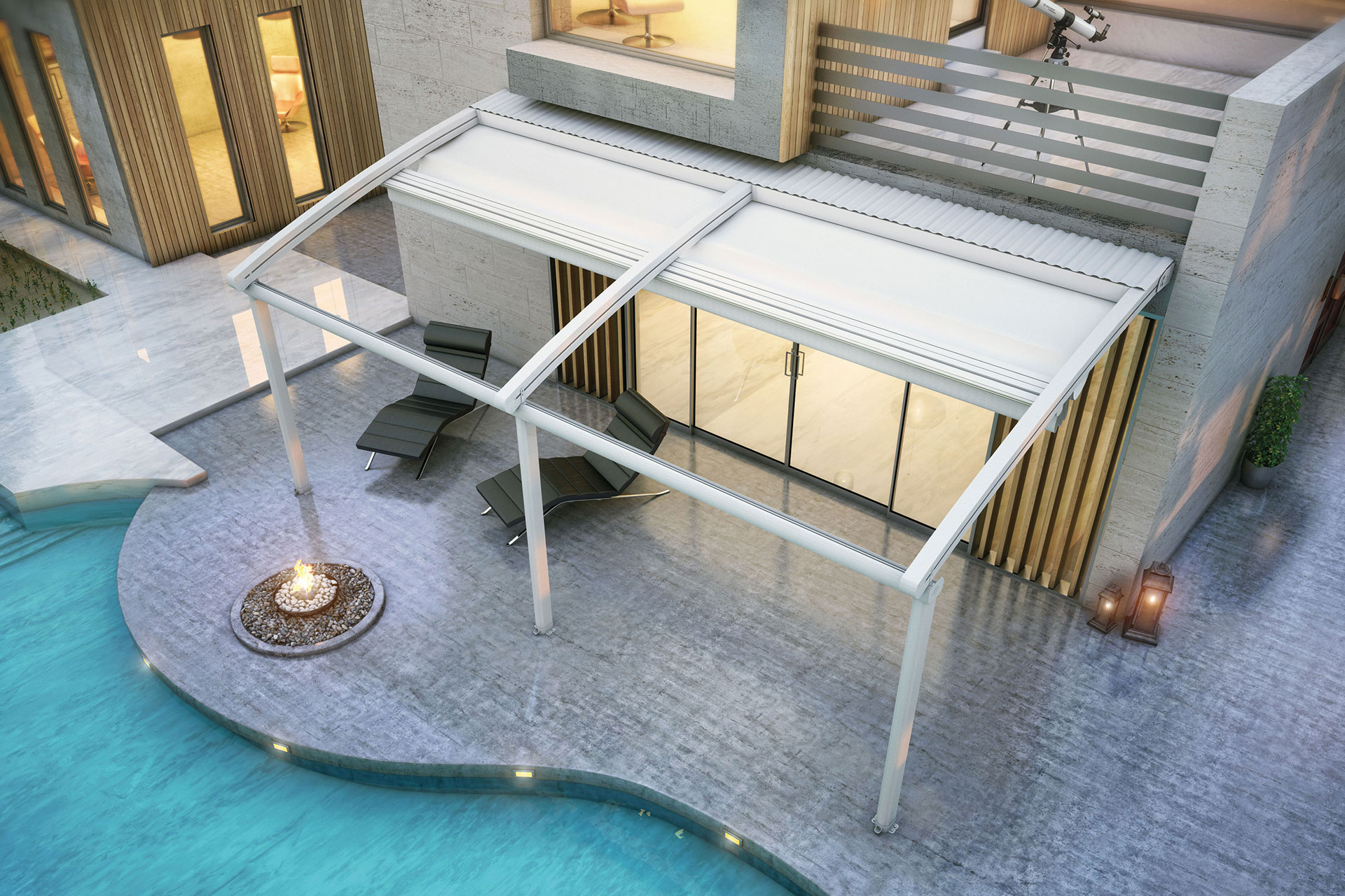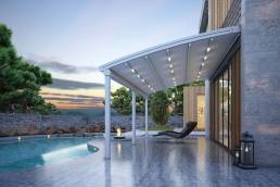 The Tectona Pergola System was designed as a maximum front of 13.50m X maximum opening of 10.00m. Tectona allows opening and closing an area of 135 sqm with one-button technology. Carrier rails with dimensions of 12X16 cm max. It is produced in 10.00 m length and in 3 different forms.
